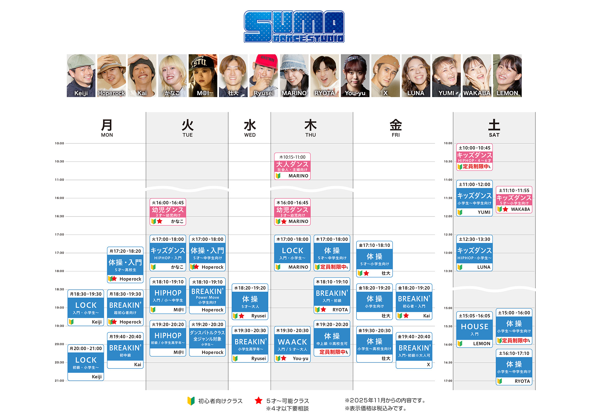 ◆レッスンスケジュール ※2025年11月からの内容です インストラクター かなこ幼児3才~/キッズ MARINO幼児3才~/LOCK You-yuWAACK M@IHIPHOP Hope rockBREAKIN’/体操 RyuseiBREAKIN’/体操 KaiBREAKIN’ RYOTABREAKIN’/体操 LUNAキッズダンス YUMIキッズダンス WAKABAキッズダンス LEMONHOUSE KeijiLOCK 壮大体操 XBREAKIN’ レッスンスケジュールはこちら